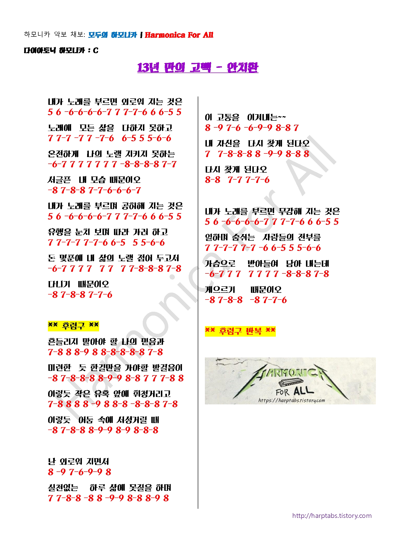 | 다이아토닉 하모니카 악보 | 안치환 - 위하여 (0) | 2022.05.15 |