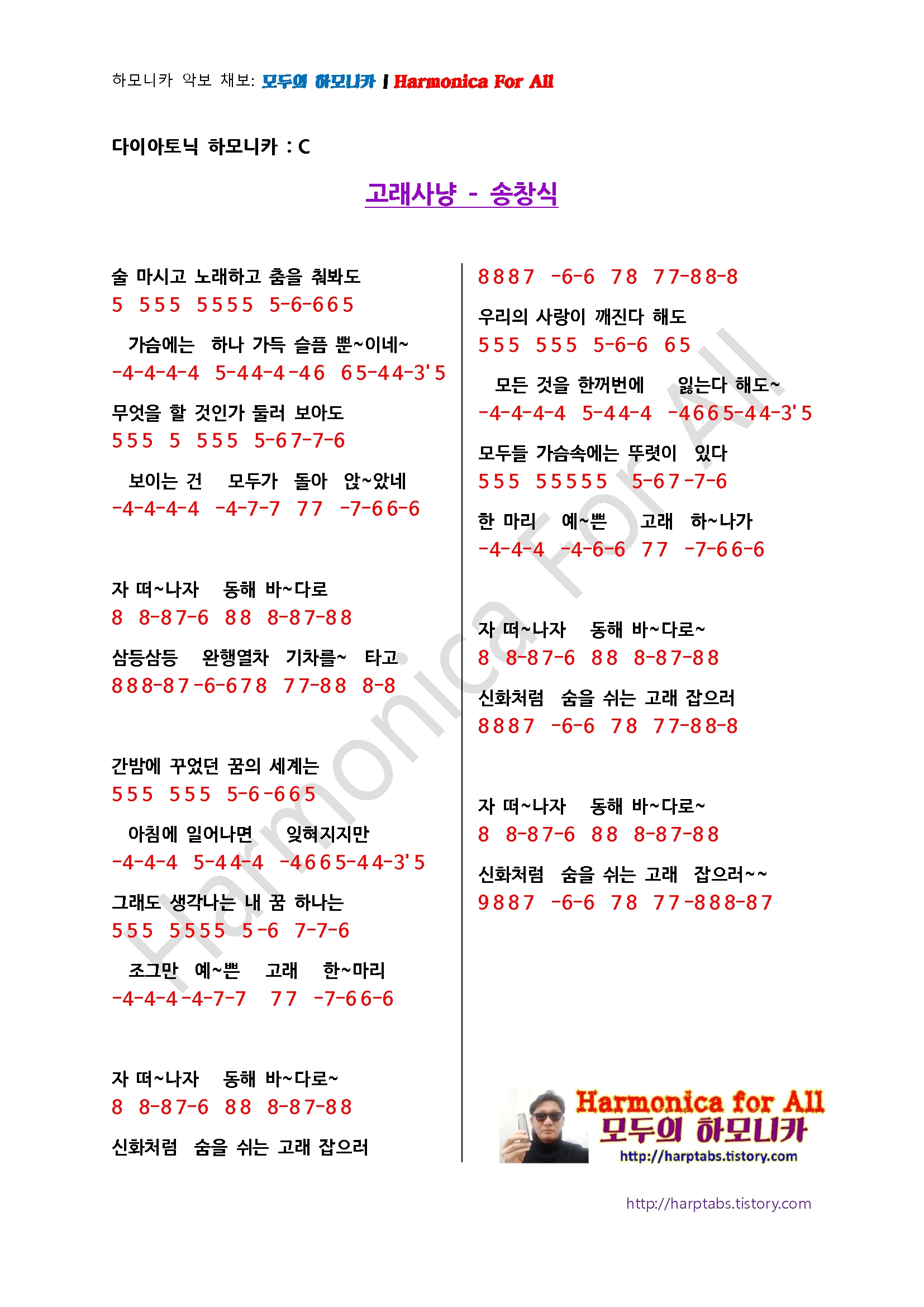| 포장마차 - 김호철 | 민중가요 하모니카 악보 탭 배우기 [모두의 하모니카], G키 (1) | 2023.04.10 |