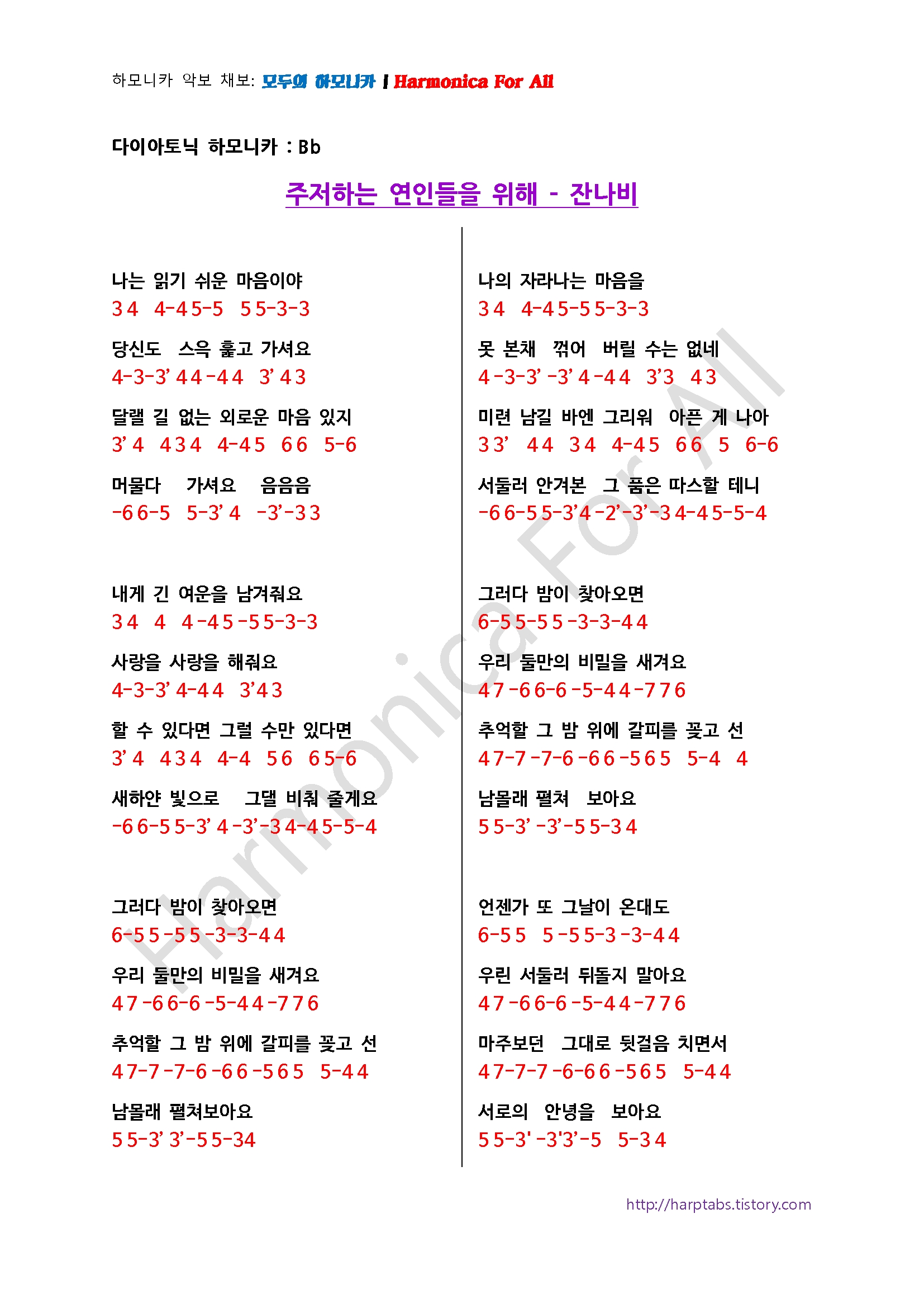 | 그대 떠나는 날에 비가 오는가 - 잔나비 (원곡: 김창완) | 다이아토닉 하모니카 배우기 악보 탭 [모두의 하모니카], G키 (0) | 2023.05.21 |