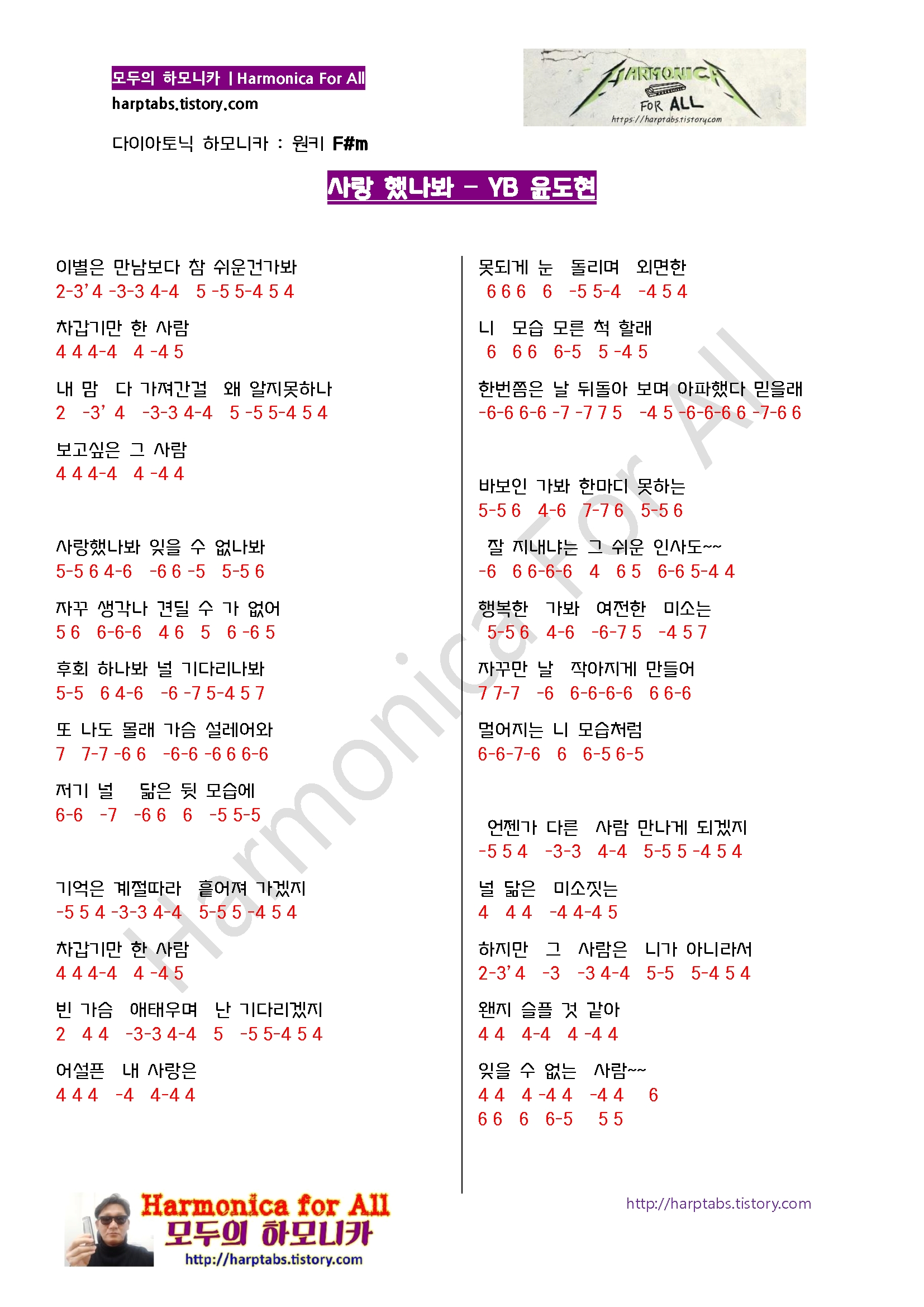 | 나는 나비 - YB(윤도현 밴드) | 하모니카 탭 배우고 따라하기 악보 [모두의 하모니카] (0) | 2023.07.28 |
