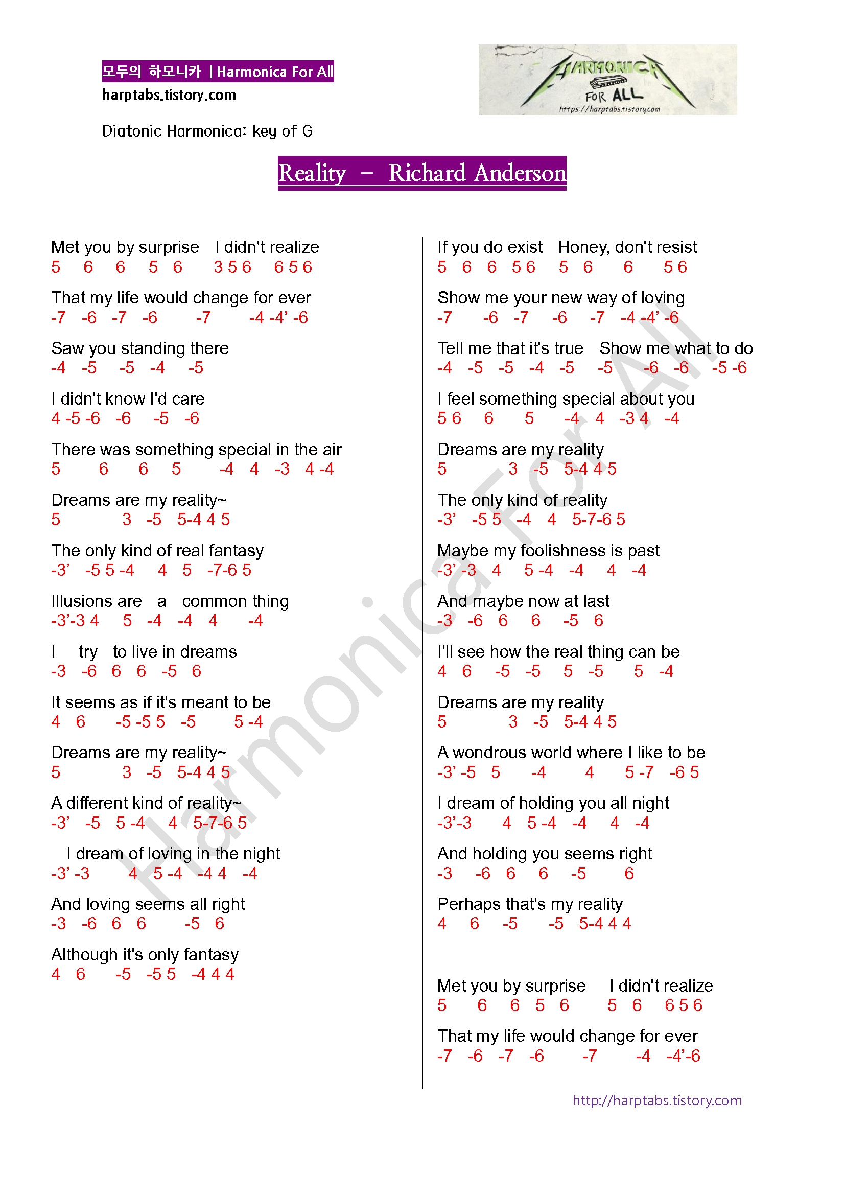 연주 시 주의할 점 (Points to play) | 노래중간에 반음올림, 내림이 있는 부분은 온음으로 처리하다보니 약간 매끄럽지 않은 부분이 있을수도 있습니다. In the middle of the song, there are semitone rise or fall that may not be smooth because it is written as a whole tone. 유튜브의 Reality harmonica cover 영상이 있으면 참고하려고 찾아보았으나, 다들 크로매틱하모니카로 연주뿐이고 다이아토닉 하모니카 커버 영상은 찾지를 못했습니다. 다이아토닉으로는 연주가 어려운 곡(반음올림/내림)인듯 합니다. |