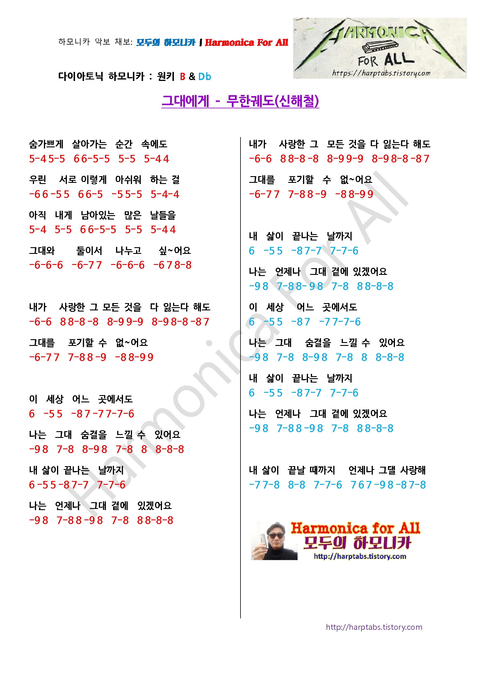 | 내 마음 깊은곳의 너 - 신해철 | 하모니카 악보 가사 탭, 다이아토닉 (1) | 2023.12.17 |