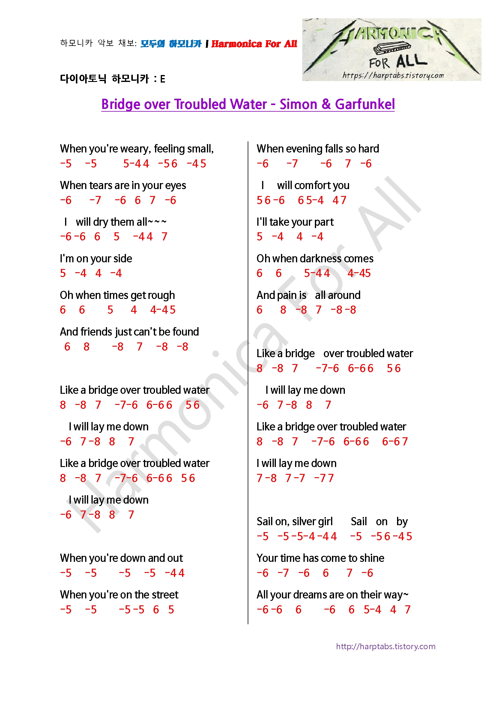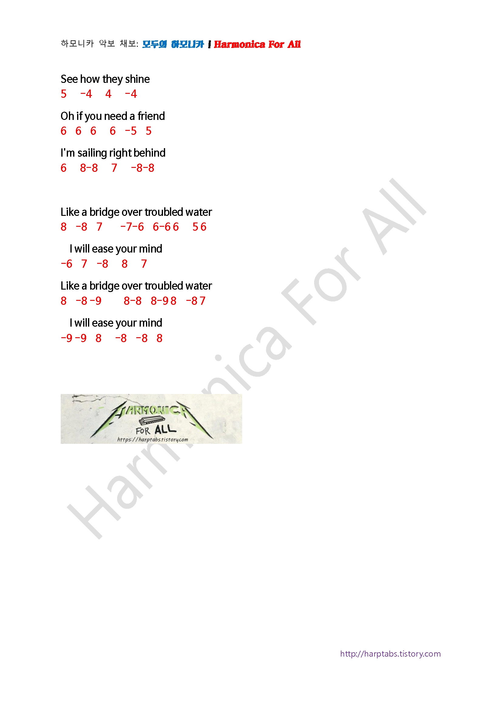Bridge over Troubled Water - Simon & Garfunkel | Harmonica tabs music sheet 하모니카 악보 [Harmonica For All]