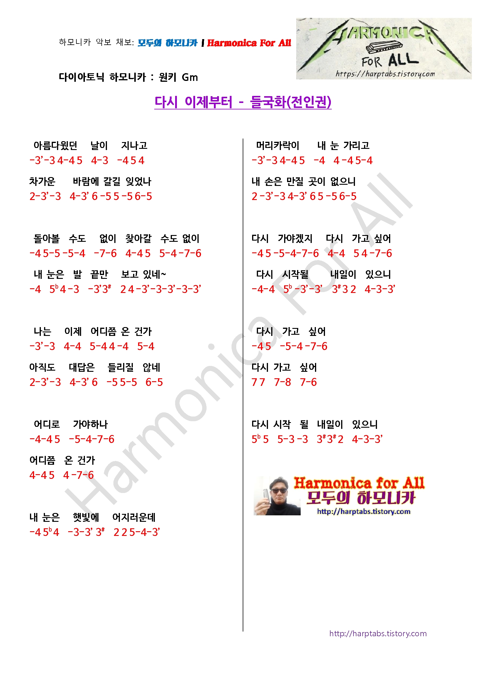 다시 이제부터 - 전인권 (들국화) | 하모니카 탭 악보 다이아토닉 [모두의 하모니카]