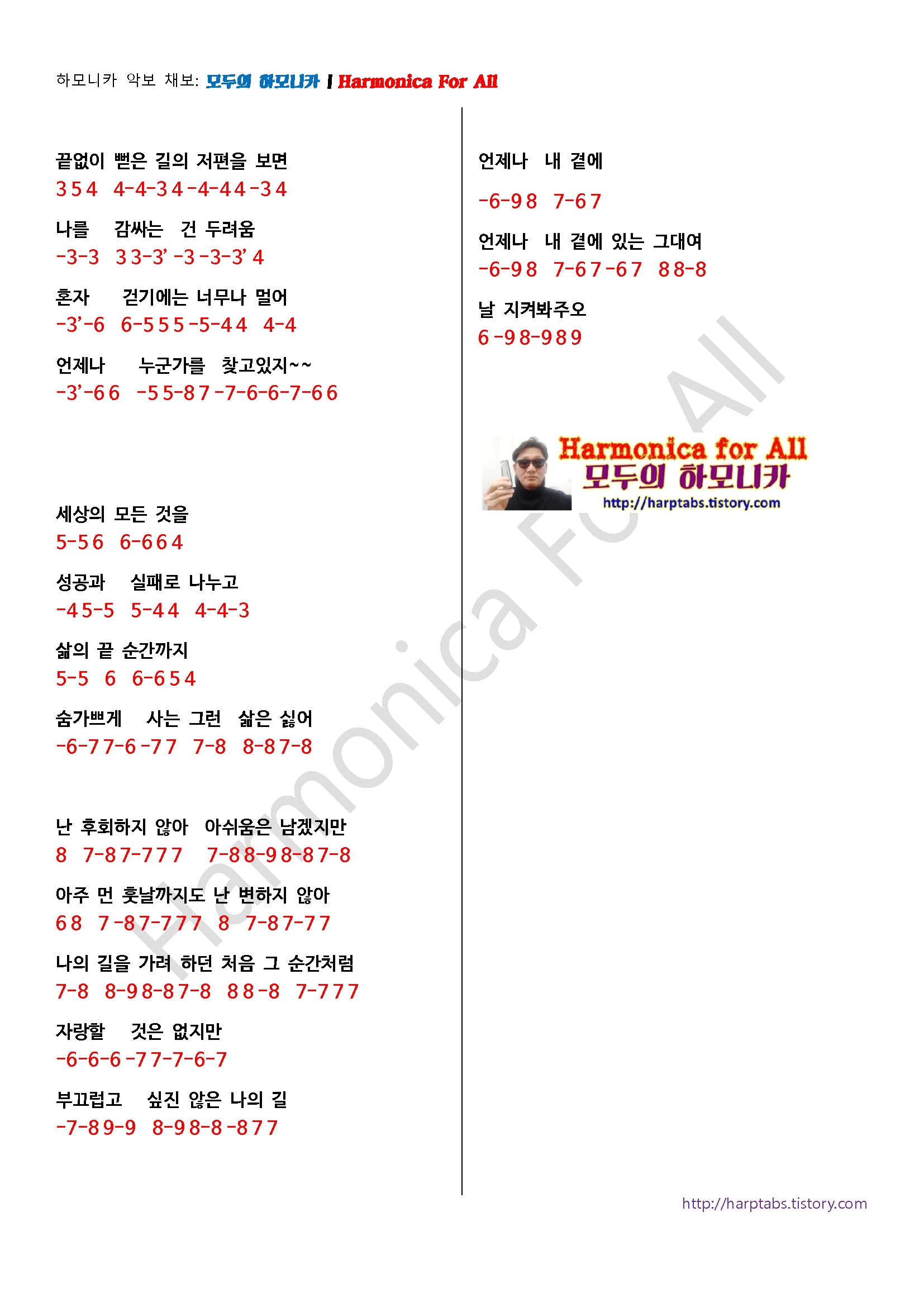 상록수 - 양희은 (김민기 작사/작곡) | 하모니카 탭 악보 A키 다이아토닉 (0) | 2024.07.27 |