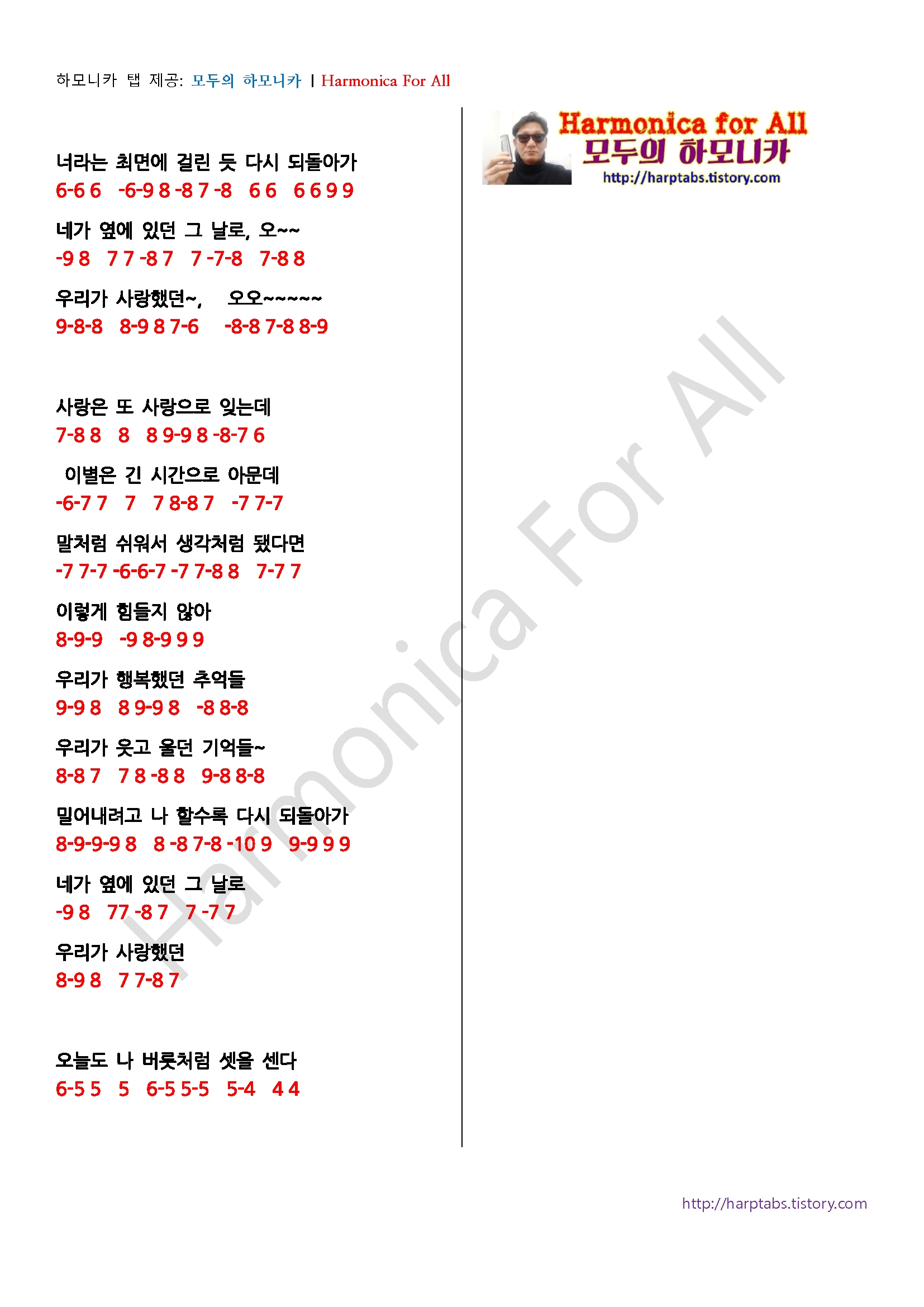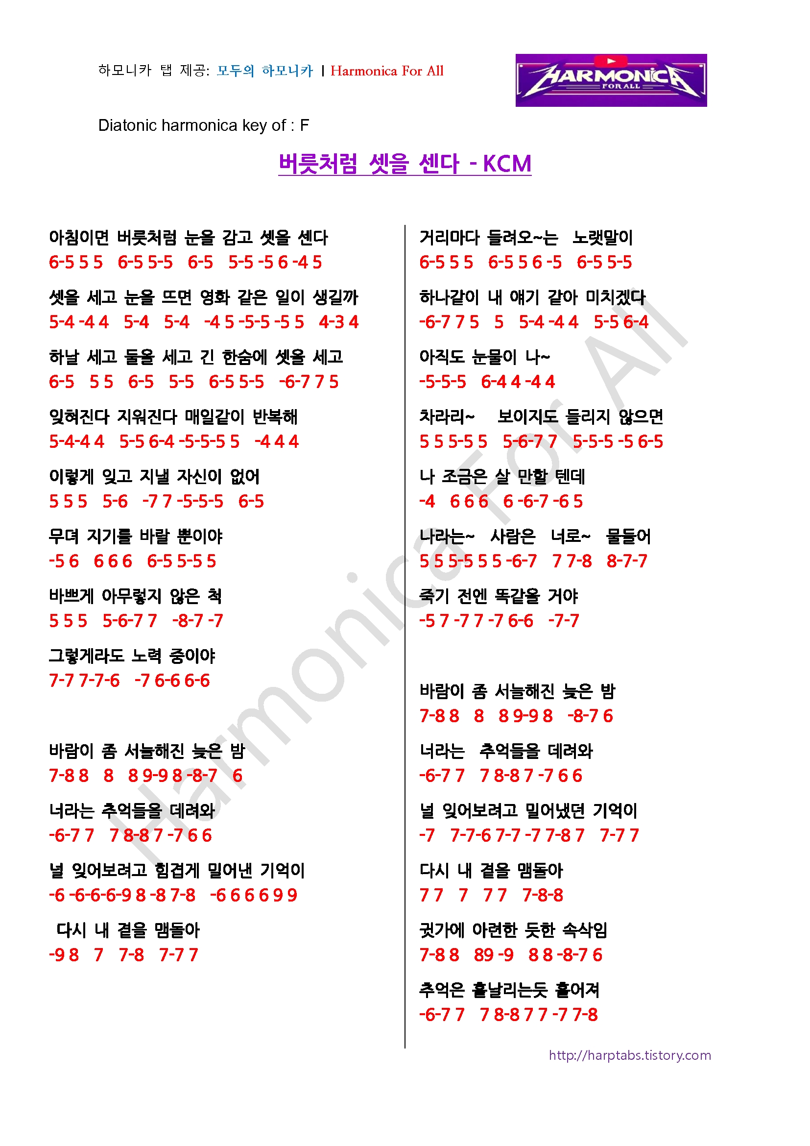버릇처럼 셋을 센다 - KCM | 하모니카 가사 악보 탭 (F키)