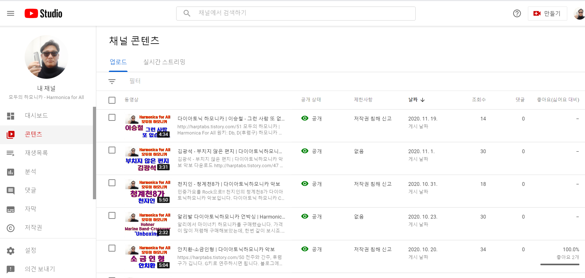 원래 목적은 하모니카 악보(탭)을 공유하고자 시작한 유튜브인데, 탭만 공유할 수는 없으니 연습도 하며 유튜브 영상을 올리게 되었는데.